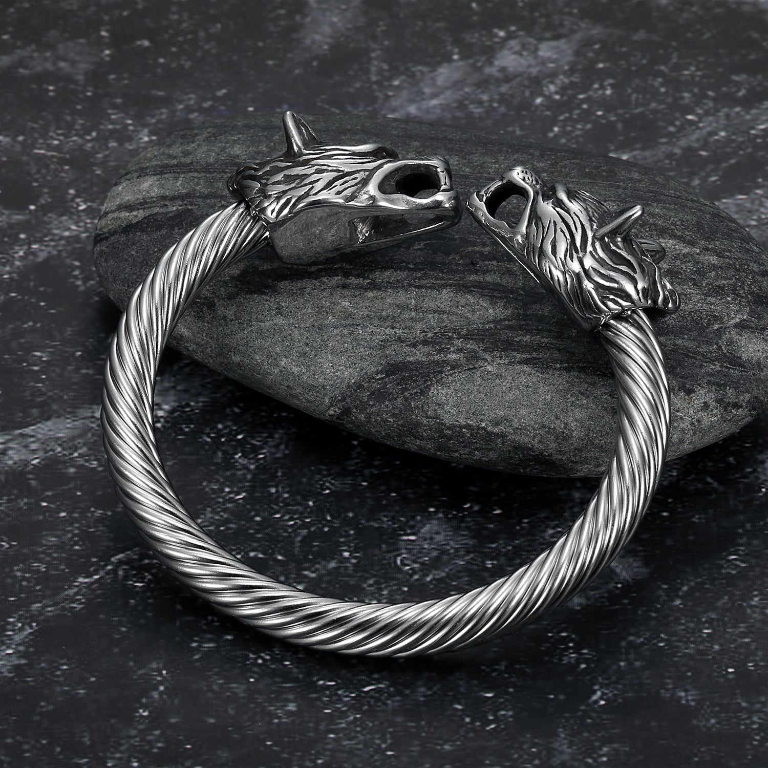 Nordic Pride Handcrafted Stainless Steel Large Grey Wolf Head Torc Bracelet