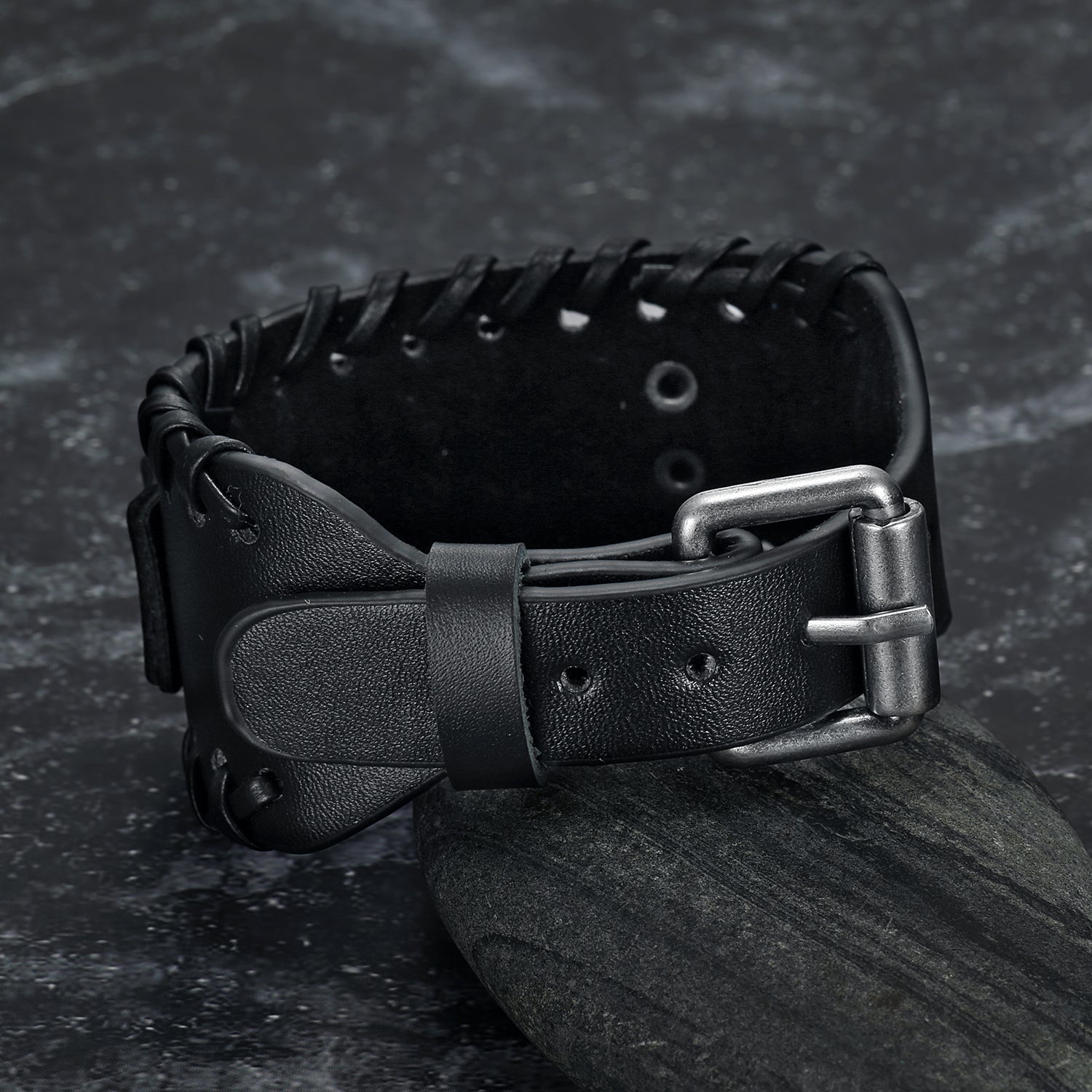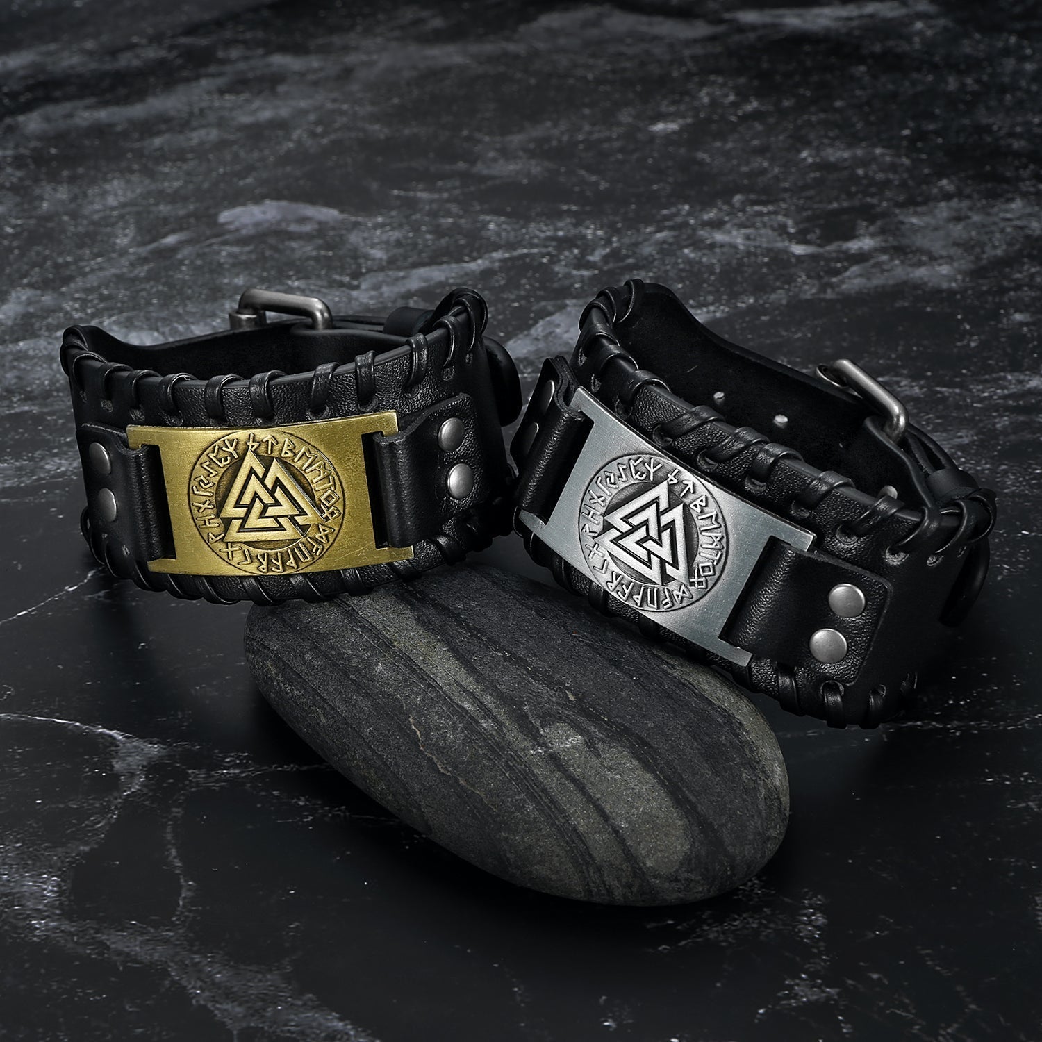 Nordic Pride Leather Buckle Arm Cuff With Metal Valknut Symbol Design